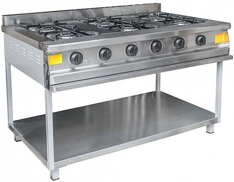 Плита газовая без духовки ПГ-6 предназначена для тепловой обработки пищевых продуктов (варка, жарка, разогрев) на предприятиях общественного питания. Лицевая и верхняя части корпуса выполнены из нержавеющей стали, остальные части - из окрашенной порошковой краской стали серого цвета.