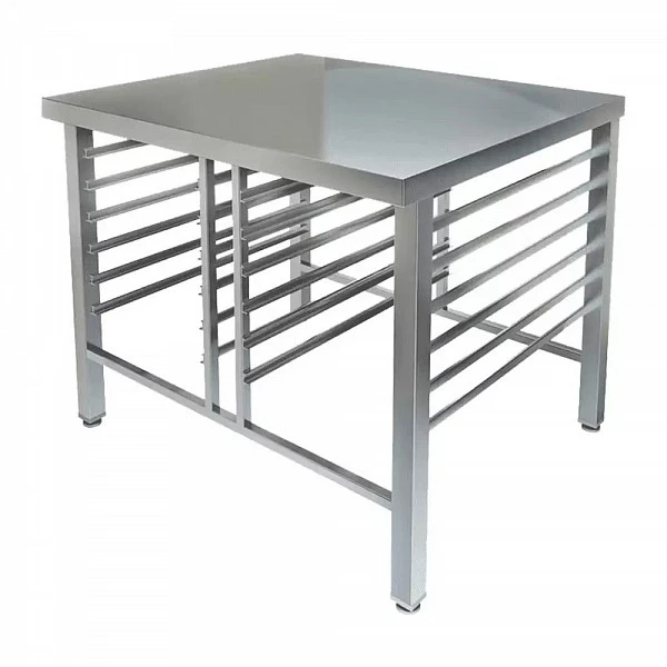 Подставка под пароконвектомат открытая, полозок из нержавеющей стали марки AISI 304 толщиной 1мм, каркас разборный из трубы 40х40 нержавеющей стали марки AISI 304 толщиной 1,2мм, 2 ряда по 7 уровней (для RATIONAL). Регулируемые опоры. Подставка поставляется в разобранном виде.