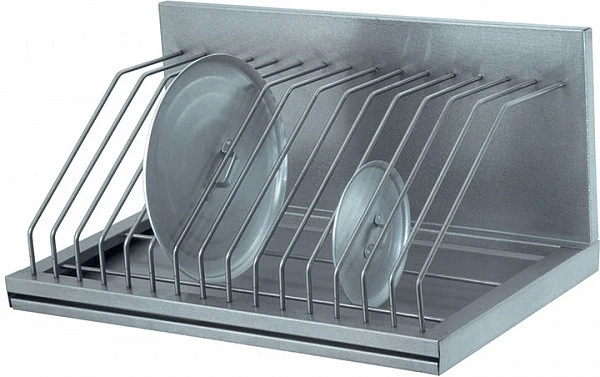Полка имеет 6 отделений, выполненных из нержавеющего прутка (сталь AISI 304), для размещения крышек диаметром от 160 до 500 мм.
