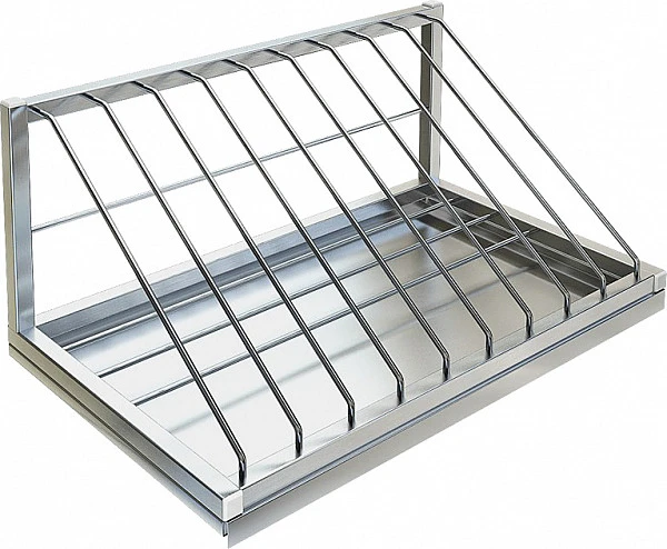 Полка для сушки досок Техно-ТТ ПН-117/600 предназначена для сушки и хранения разделочных досок на предприятиях общественного питания и торговли. Изделие крепится к стене при помощи шурупов. Сварной раскладывающийся каркас выполнен из нержавеющей стали AISI 304.