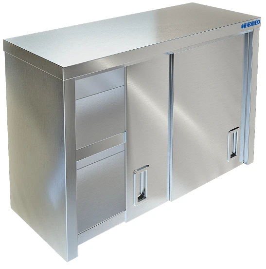 Полка настенная Техно-ТТ ПН-424/2000 используется в кухонных цехах для хранения посуды, кухонного инвентаря, сухих видов продуктов и столовых приборов. Полка-шкаф цельносварная снабжена дверцами купе, благодаря чему не занимает пространство кухни при открытии дверей, внутри имеется одна полка, изготовлено все из пищевой нержавеющей стали марки AISI 430.