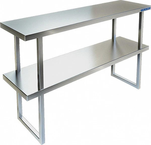 Полка настольная для столов со столешницей ЛДСП разборная из нержавеющей стали марки AISI 430 толщиной 0,8мм, с усилителем, 2 яруса. Боковины (стойки) из трубы 20х20 нержавеющей стали марки AISI 430 толщиной 1,2мм. Крепление к столу болтовое через отверстие в столешнице. Полка поставляется в разобранном виде.