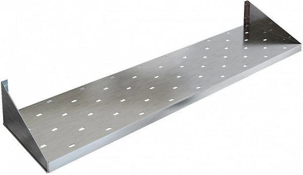 Полка перфорированная изготовлена из пищевой нержавеющей стали марки AISI 430, крепится к стене при помощи двух боковых кронштейнов, которые можно установить как вверх, так и вниз для удобства размещения.
