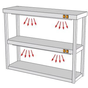 Подогрев осуществляется за счет ИК керамических нагревателей, которые прогревают как саму поверхность полки так и продукт находящейся под ней.