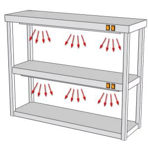 Подогрев осуществляется за счет ИК керамических нагревателей, которые прогревают как саму поверхность полки так и продукт находящейся под ней.