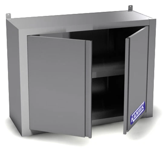 Полка настенная с двумя распашными дверцами для временного хранения и размещения посуды, инвентаря в цехах и моечных отделениях предприятий питания изготовлена полностью из нержавеющей стали.