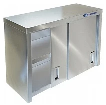 Полка-шкаф снабжена дверьми-купе, благодаря чему не занимает пространство кухни при открытии дверей, внутри имеется одна полка, изготовлено все из пищевой нержавеющей стали марки AISI 430.