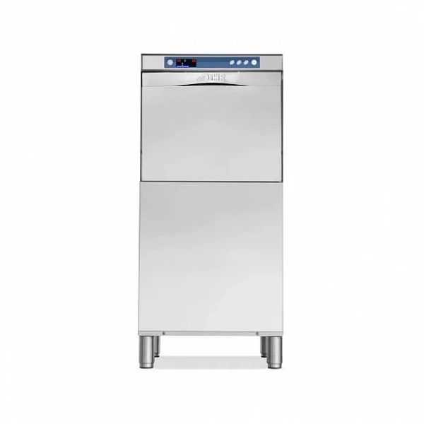 Корпус из нержавеющей стали AISI 304, шумо- и теплоизолирующую дверцу с двойными стенками и защитным микровыключателем, цельнотянутую ванну с наклоном для полного слива и интегрированную систему переливной и сливной трубки для тройной защиты моечной помпы. Специальная форма крыши камеры предотвращает попадание капель на свежевымытую посуду.