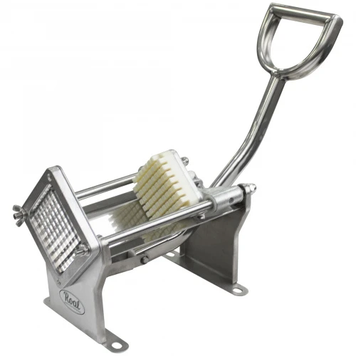 Для использования оборудования достаточно выбрать и установить нужное лезвие, помыть картофель и положить его перед толкателем и плавно переместить ручку направляющей толкателя.