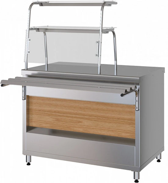 Прилавок нейтральный с полками Марихолодмаш ПНП11 из линии раздачи питания "ШЕФ" 1120 из нержавеющей стали. Изделие относится к разряду профессионального кухонного оборудования и предназначено для кратковременного хранения и раздачи потребителю хлебобулочных и кондитерских изделий, а также для установки на столешнице нижнего модуля термостатов с напитками самостоятельно или в составе технологических линий раздачи.