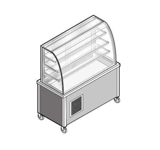 Модель имеет 3 стеклянные полки для выкладки продукции и холодильную ванну из нержавеющей стали. Для удобного доступа к содержимому витрины со стороны оператора имеются двери-купе, со стороны клиента витрина закрытая.