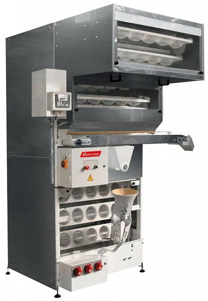 В ячейки кассет раздатчик укладывает заданное количество тестовых заготовок (от 1 до 5), поступающих с тестоокруглителя. В процессе предварительной расстойки перегрузка тестовых заготовок из кассеты в кассету (из ячейки в ячейку) не происходит. После расстойки тестовые заготовки выгружаются на ленту транспортера, который подает их в приемный бункер тестозакаточной машины.