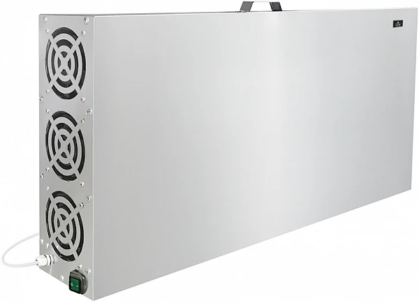 - Прохождение воздуха через внутренний объем облучателя обеспечивается вентилятором через вентиляционные отверстия, расположенные в корпусе облучателя. Конструкция облучателя-рециркулятора обеспечивает защиту присутствующих в помещении людей от коротковолнового ультрафиолетового излучения.