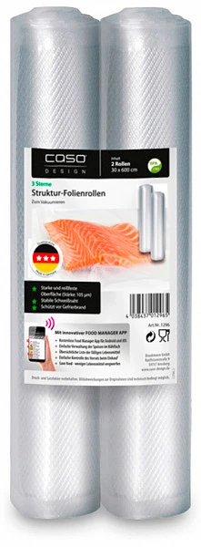 С рулонами для вакуумирования обеспечивается удобное хранение свежих овощей и фруктов, неиспользованных продуктов, полуфабрикатов, маринование мяса и рыбы, создание заготовок. В комплекте 2 рулона размером 30х600 см, а также стикеры с QR-кодом. При помощи приложения «Caso Food Manager» Вы всегда сможете контролировать количество продуктов в холодильнике, а также сроки их хранения.