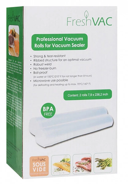 Рулоны для вакуумной упаковки Ellrona FreshVACpro 20х600 производятся из качественных пищевых полимеров, в составе которых не содержатся вредные элементы.