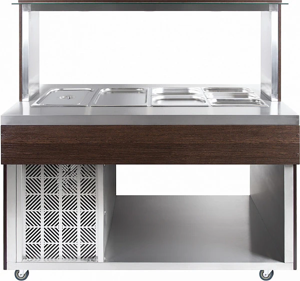 Модель оснащена встроенной охлаждаемой ванной для размещения гастроемкостей, верхней крышкой со стеклом и колесами со стопорами. Корпус выполнен из нержавеющей стали AISI 430, отделка фасада - ЛДСП высокого качества с обработанной кромкой.
