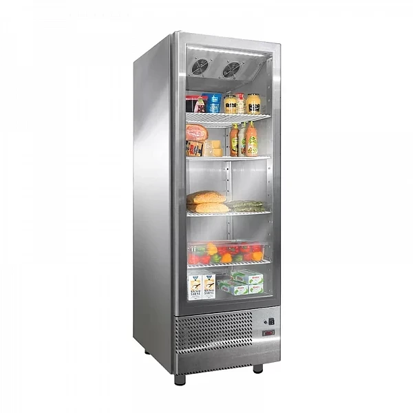 Шкаф обеспечивает поддержание температуры в пределах от -2 до +8°С, что оптимально подходит для хранения мяса, рыбы и полуфабрикатов. Имеет динамический тип охлаждения и автоматическую систему оттайки с испарением конденсата. Холодильный агрегат находится в отдельном отсеке. Внутри шкафа расположен воздухоохладитель с вентиляторами, которые обеспечивают равномерное распределение холодного воздуха внутри полезного объема шкафа. Прозрачная стеклянная дверь позволяет быстро находить необходимые продукты в камере. Дверь можно перенавешивать, меняя направление ее открывания. Герметичный корпус и все конструктивные элементы шкафа изготовлены из нержавеющей стали.