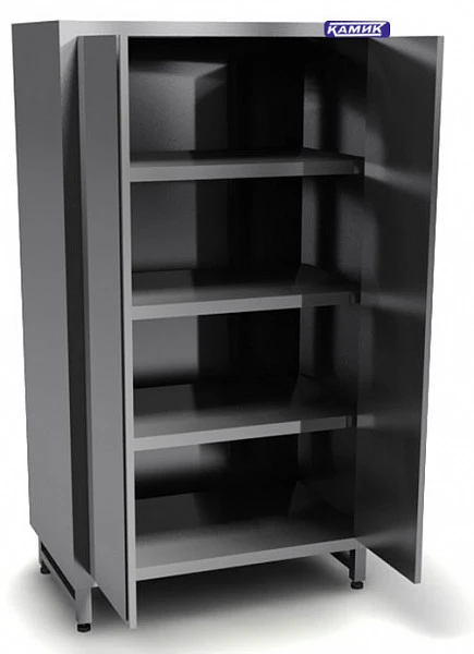 Шкаф для хранения кухонного инвентаря, столовой посуды, белья и продуктов на предприятиях питания изготовлен полностью из нержавеющей стали.