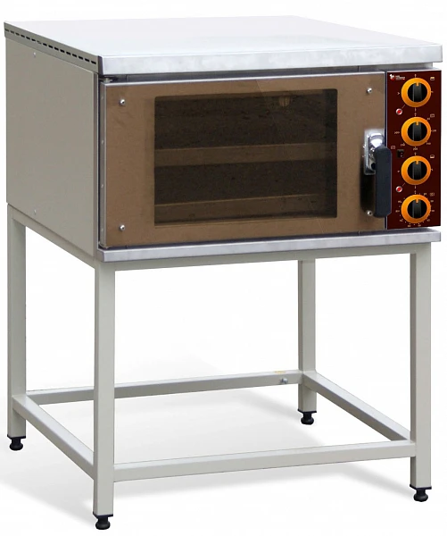 Шкаф жарочный электрический имеет модульную конструкцию в виде подставки нескольких духовых шкафов и крышки (поставляется в собранном виде). Подставка выполнена из профильных элементов конструкционной стали толщиной 1,5 мм., ножки из профильной трубы 40х40 и окрашена порошковой краской серого цвета.