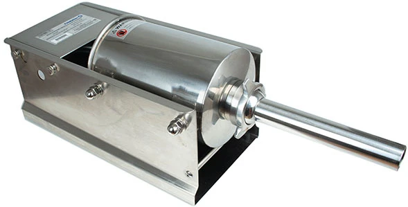 Принцип работы этих механизмов достаточно прост: в цилиндр аппарата помещают заранее приготовленный фарш, специальный поршень проталкивает продукт к воронке, на которой надета оболочка.