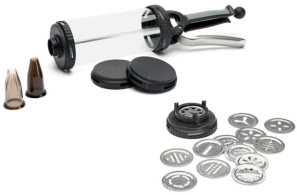 Идеально подходит для густых продуктов, таких как кремы, густые муссы, заварное тесто...Поставляется со специальным набором для песочного печенья, состоящим из 2-х простых крышек, специальной крышки (держателя дисков) и 13 съемных декоративных дисков для приготовления разнообразного и оригинального песочного и заварного теста.