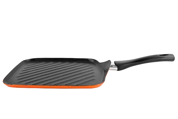 Эргономичная ручка сковороды-гриль из качественного бакелита удобно лежит в руке.