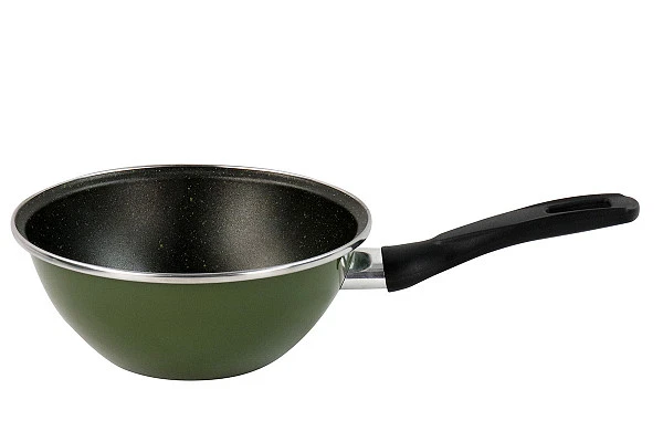 Эргономичная ручка сковороды-вок из качественного бакелита удобно лежит в руке.