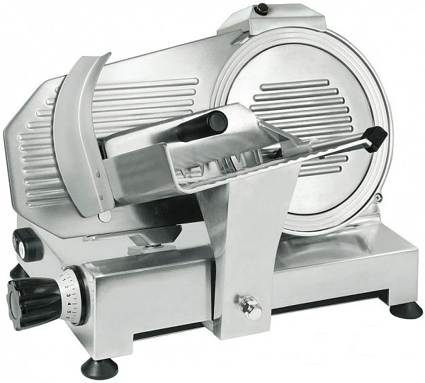 Изготовлен из алюминия, пригодного для использования с продуктами питания, имеет удобную каретку, мощный и тихий двигатель, встроенное устройство для заточки лезвия. Все это обеспечивает профессиональную нарезку, безопасность и легкость в использовании и обслуживании.