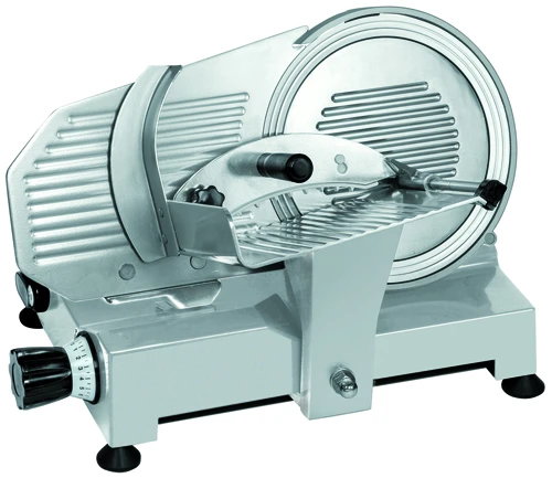 Изготовленная из алюминия, пригодного для использования с продуктами питания, имеет удобную каретку, которая легко двигается на подшипниках, лезвие, изготовленное из хромированной закаленной стали, мощный и тихий двигатель, устройство для заточки лезвия.