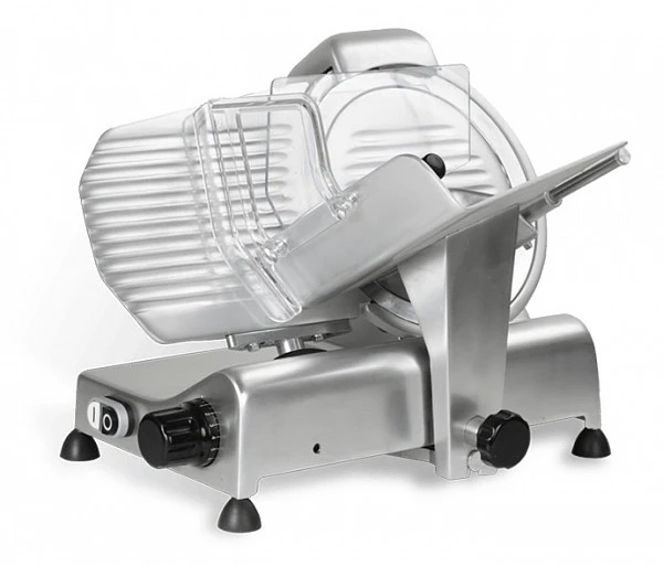 Профессиональный мотор с функцией принудительной вентиляции исключает возможность перегрева оборудования, а также делает его работу практически бесшумной. Слайсер оснащен съемным устройством для заточки ножа с двойным наждаком. Поддон для продуктов, перемычка для регулирования толщины среза, кольцо, покрывающее лезвие, и держатель продуктов выполнены из алюминия, отполированного путем анодирования, что обеспечивает их гигиеническую чистоту и защиту от коррозии.