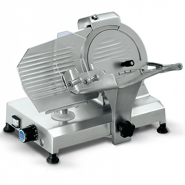 Слайсер Sirman Topaz 250 зубчатое лезвие используется в сфере общественного питания и торговли для нарезки мясных деликатесов (колбас, ветчин) и твердых сортов сыра.