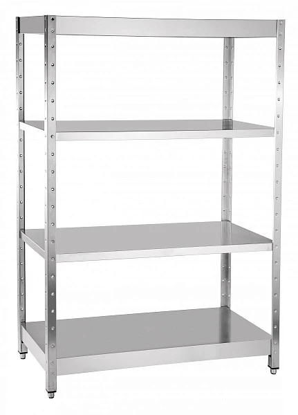 Все элементы стеллажа изготовлены из нержавеющей стали. Стойки стеллажа имеют крепежные отверстия для установки полок на любой необходимой высоте.