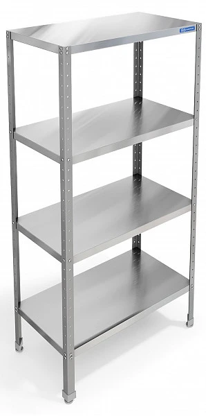 Полки сплошные изготовлены из нержавеющей стали AISI430 толщиной 0,8мм , могут крепиться на требуемой высоте - шаг 100 мм.