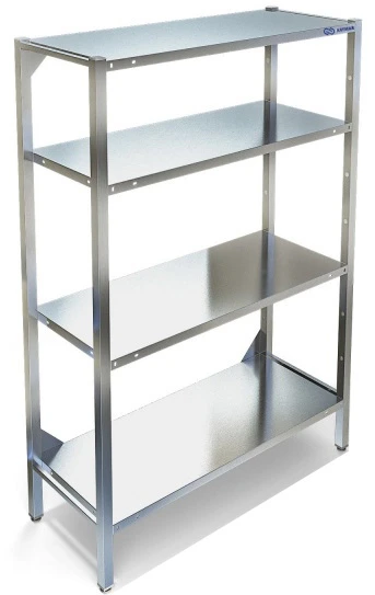 Полки стеллажа сплошные из нержавеющей стали AISI 430, крепятся на требуемой высоте с шагом 100 мм.