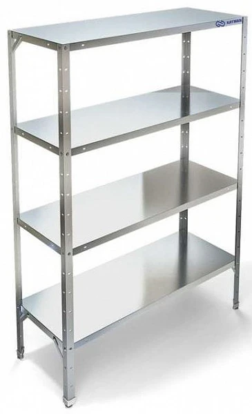 Стеллаж кухонный Kayman СК-221/0803 (212048). Стойки из нержавеющей стали AISI 430 (труба 40х40), полки сплошные из нержавеющей стали AISI 430. Используется в кухонных цехах для хранения сухих видов продуктов и кухонного инвентаря.