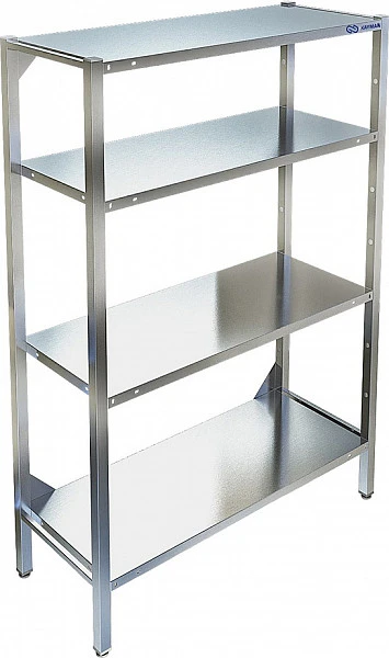 Стеллаж имеет разборную конструкцию и состоит из четырёх стоек и четырёх полок. Стойки изготовлены из нержавеющего уголка 40х40, толщиной 1.5мм. Полки сплошные изготовлены из нержавеющей стали AISI430 толщиной 0,8мм , могут крепиться на требуемой высоте - шаг 100 мм. Ножки стеллажа снабжены регуляторами высоты, что позволяет устранять неровности пола и дополнительные конструктивные элементы, предназначенные для предотвращения его раскачивания во время работы и придающие большую устойчивость. Универсальная конструкция позволяет легко производить сборку стеллажей. Нагрузка на каждую полку не более 150кг, при этом не более 400 кг на весь стеллаж.