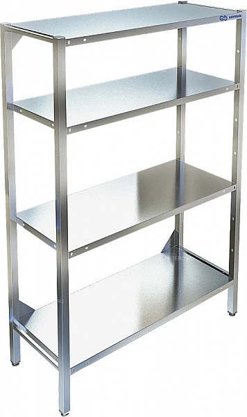 Четыре сплошные полки из нержавеющей стали марки AISI 304 толщиной 0,8мм. Расстояние между полками регулируемое с шагом 50мм.