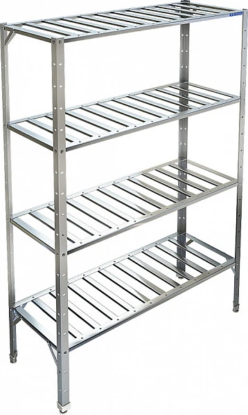 Разборный каркас выполнен из уголка 40х20 мм нержавеющей стали AISI 304 толщиной 1,2 мм, решетчатые полки - из нержавеющей стали AISI 304 толщиной 0,8 мм.