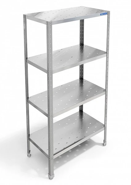 Стойки из нержавеющей стали AISI 430 (уголок 40х40), полки перфорированные из нержавеющей стали AISI 430. Стеллажи используются в кухонных цехах для хранения сухих видов продуктов и кухонного инвентаря. Стеллаж имеет разборную конструкцию и состоит из четырёх стоек и четырёх полок.