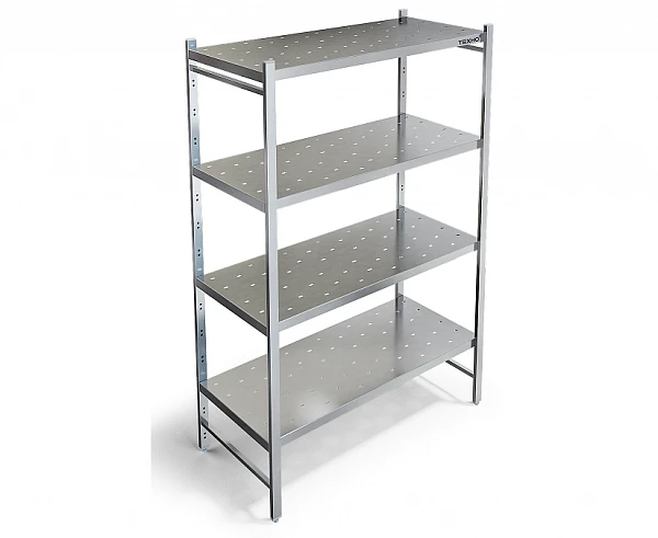 Четыре перфорированные полки из нержавеющей стали марки AISI 304 толщиной 0,8мм. Максимальная нагрузка на полку 150кг. Расстояние между полками регулируемое с шагом 120мм. Регулируемые опоры.