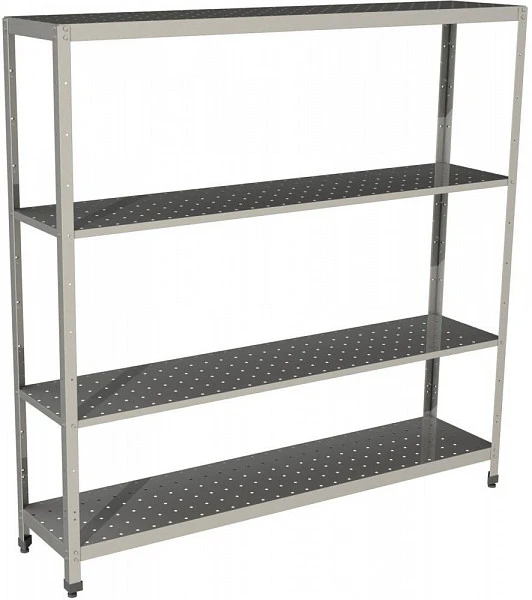 Стеллаж состоит из вертикальных опор и стальных полок с перфорацией.