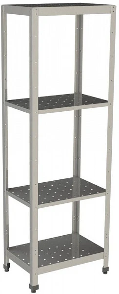 Стеллаж состоит из вертикальных опор и стальных полок с перфорацией.