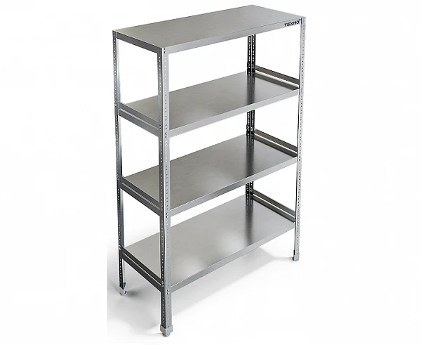 Стеллаж имеет разборную конструкцию и состоит из четырёх стоек и четырёх полок. Стойки изготовлены из конструкционного профиля толщиной 2 мм, покрытого порошковой краской. Полки сплошные изготовлены из нержавеющей стали AISI304, могут крепиться на требуемой высоте - шаг 100 мм. Ножки стеллажа снабжены регуляторами высоты, что позволяет устранять неровности пола и дополнительные конструктивные элементы, предназначенные для предотвращения его раскачивания во время работы и придающие большую устойчивость. Универсальная конструкция позволяет легко производить сборку стеллажей. Нагрузка на каждую полку не более 150 кг, при этом не более 400 кг на весь стеллаж. При необходимости можно приобрести любое количество полок дополнительно.