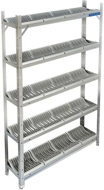 Стеллаж сделан из стоек и полок. Полка состоит из кассеты для тарелок и каркаса. Кассета представляет собой решётку с ячейками, в которые помещаются тарелки.
