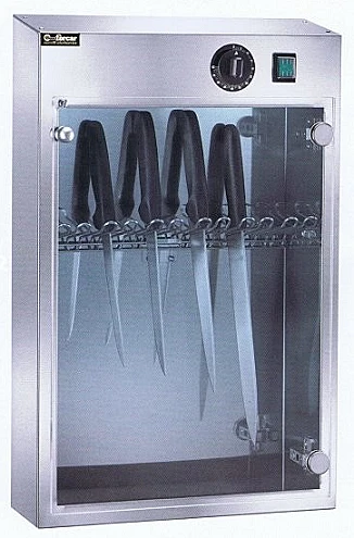 Стерилизатор для ножей Forcar SUV 10 ультрафиолетовый имеет корпус из полированной нержавеющей стали AISI304 и дверцу из прозрачного плексигласа.