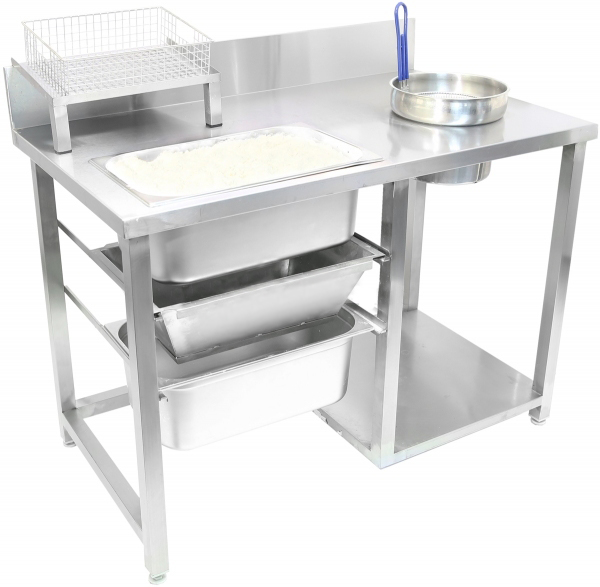 Стол ТТМ 141165 с ручным просеиванием используется на предприятиях общественного питания для панировки различных продуктов с последующим приготовлением во фритюре.