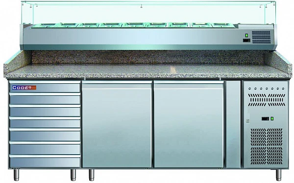 Стол для пиццы Cooleq PZ2610TN-VRX380 используется на предприятиях общественного питания и торговли для хранения пиццы, салатов, сэндвичей и других блюд и ингредиентов к ним в охлажденном состоянии.
