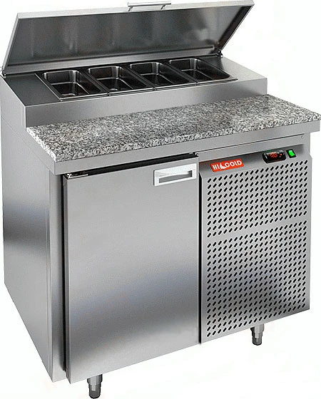 Стол для пиццы Hicold PZ1-1/GN(1/3H) с каменной столешницей и распашными дверями используется для раскатки теста и обработки ингредиентов для приготовления пиццы, а также для охлаждения и кратковременного хранения скоропортящихся продуктов и напитков на предприятиях общественного питания и торговли.