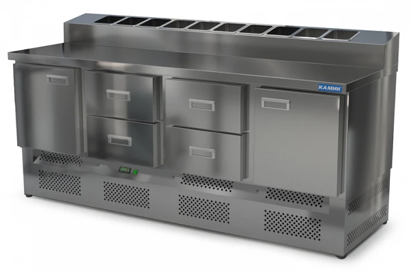 Стол для пиццы Камик СОП-242076Н используется на предприятиях общественного питания и торговли для хранения пиццы, салатов, сэндвичей и других блюд и ингредиентов к ним в охлажденном состоянии.