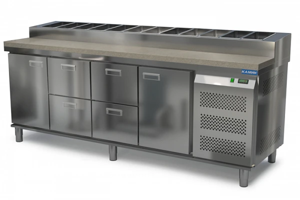 Стол для пиццы Камик СОП-242376К используется на предприятиях общественного питания и торговли для хранения пиццы, салатов, сэндвичей и других блюд и ингредиентов к ним в охлажденном состоянии.